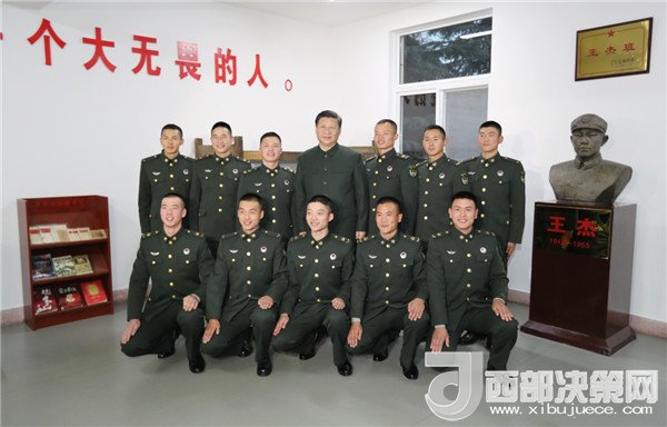 離開連隊(duì)榮譽(yù)室后,習(xí)近平來到“王杰班”。全班戰(zhàn)士列隊(duì)歡迎,習(xí)近平微笑著同他們一一握手?,F(xiàn)任班長王大毛向習(xí)近平介紹了戰(zhàn)士們爭做王杰傳人的情況。50多年來,連隊(duì)每天點(diǎn)名第一個(gè)呼點(diǎn)王杰??吹酵踅芫裨谶B隊(duì)得到很好傳承,看到尊崇英雄、學(xué)習(xí)英雄氛圍這么濃厚,習(xí)近平很欣慰。他招呼戰(zhàn)士們圍坐一圈,詳細(xì)詢問大家的學(xué)習(xí)、訓(xùn)練、生活情況,勉勵(lì)大家再接再厲,帶頭做新時(shí)代王杰式的好戰(zhàn)士。離開連隊(duì)時(shí),習(xí)近平同全連官兵合影留念,指戰(zhàn)員們簇?fù)碇?xí)近平,充滿了幸福和喜悅。全連官兵齊唱連歌“王杰的槍我們扛”,表達(dá)了廣大官兵堅(jiān)決聽習(xí)主席的話、自覺做英雄傳人的堅(jiān)定決心。