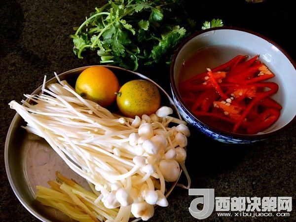 材料:金桔,香菜,金針菇,紅椒,熟鴨脯,姜絲。