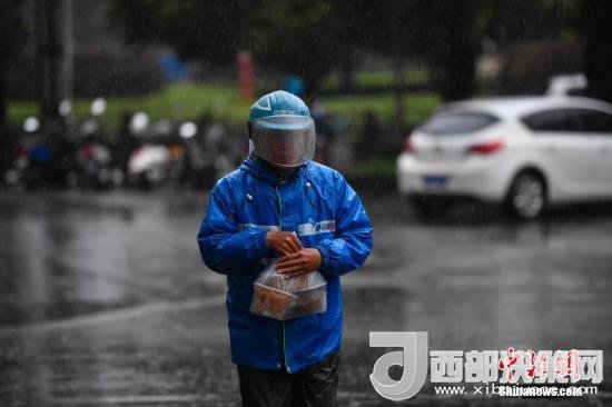資料圖:外賣小哥冒雨送餐。中新社記者 劉冉陽(yáng) 攝