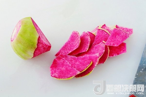1、紅心蘿卜洗凈泥沙切成小塊。