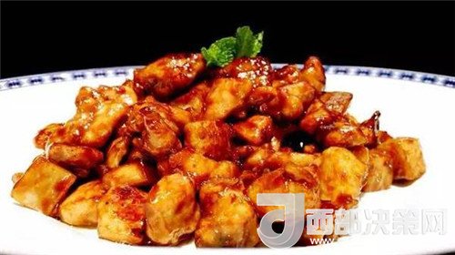 3、炒鍋留油,放蔥姜末熗鍋,下面醬、醬油、糖炒至紅亮,出醬香味。下雞丁煸炒。