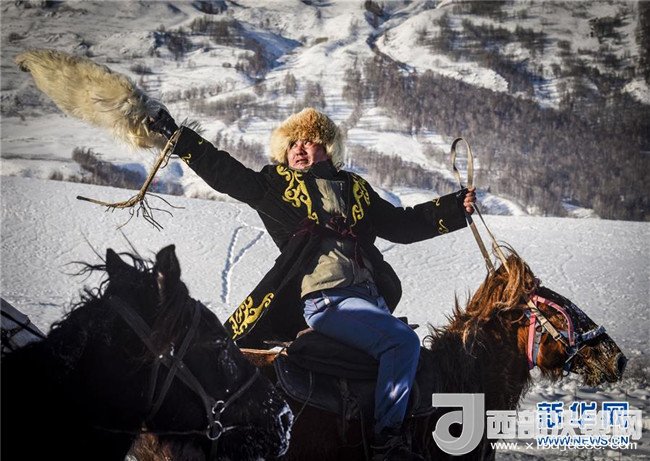 在新疆喀納斯禾木村舉辦的潑雪節(jié)上,當?shù)鼐用裨跒橛慰捅硌菅┑氐鹧颍?月1日攝)。記者 趙戈 攝