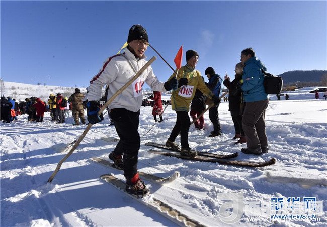 在新疆喀納斯禾木村舉辦的潑雪節(jié)上,當?shù)鼐用衲_踩古老毛皮滑雪板,正在為游客展示原始狩獵比賽(1月1日攝)。記者 趙戈 攝
