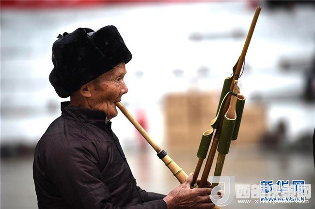 1月18日,在榕江縣仁里鄉(xiāng)仁吉侗寨,一名老人在吹奏蘆笙。記者戴天放攝