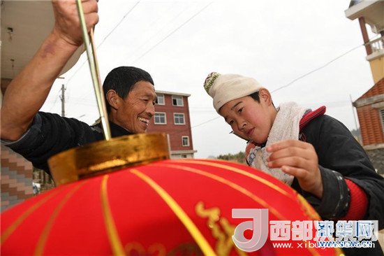 饒梅香的丈夫祝正禮(左)帶著代養(yǎng)的孩子德麗艷一起掛燈籠(2月14日攝)。