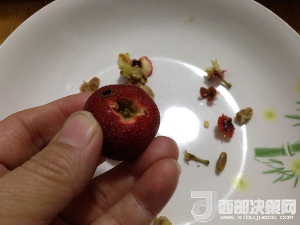 3.找一個(gè)廢筆桿,用筆桿從一端穿過(guò),山楂核就被輕松去掉了