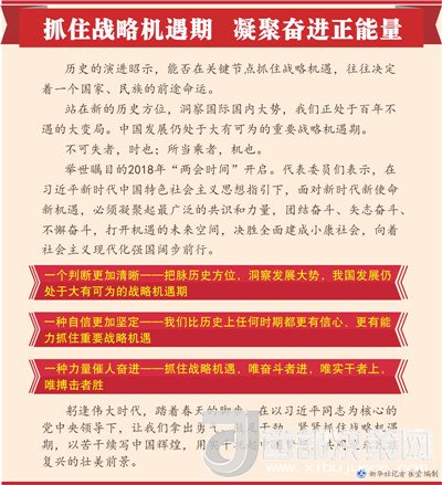 舉世矚目的2018年“兩會時間”開啟。代表委員們表示,在習(xí)近平新時代中國特色社會主義思想指引下,面對新時代新使命新機遇,必須凝聚起最廣泛的共識和力量,團(tuán)結(jié)奮斗、矢志奮斗、不懈奮斗,打開機遇的未來空間,決勝全面建成小康社會,向著社會主義現(xiàn)代化強國闊步前行。