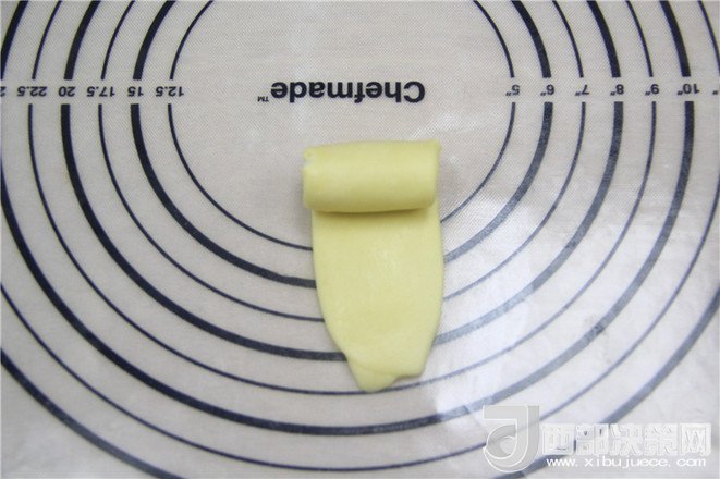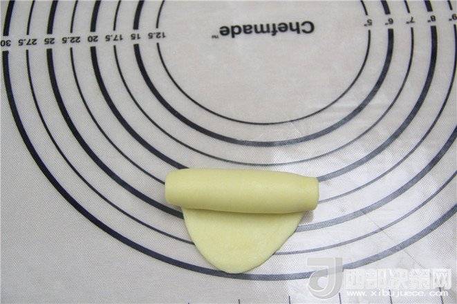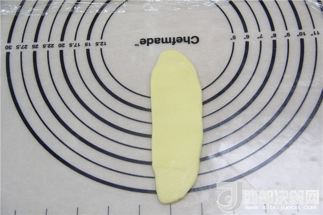 18.油酥面團直立放著,然后用搟面杖搟成長條橢圓。