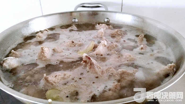3.鍋中放入清水,排骨,花椒粒,姜片適量進(jìn)行焯水。