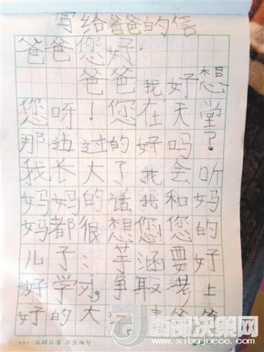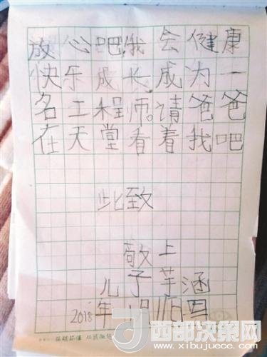 “爸爸您好。爸爸我好想您呀!您在天堂那邊過的好嗎?我長大了,我會聽媽媽的話。我和媽媽都想您。您的兒子芋涵要好好學習,爭取考上好的大學。請爸爸放心吧。我會健康快樂成長為一名工程師。請爸爸在天堂看著我吧。此致,敬上。兒子芋涵。2018年1月11日寫。”