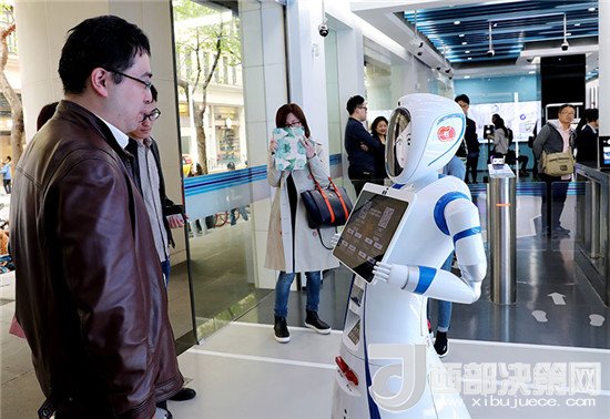 一位市民在位于上海九江路的無(wú)人銀行入口處向迎賓機(jī)器人說(shuō)明需要辦理的業(yè)務(wù)種類(4月12日攝)。近日,中國(guó)建設(shè)銀行在上海九江路開出國(guó)內(nèi)首家無(wú)人銀行。新華社記者 方喆 攝