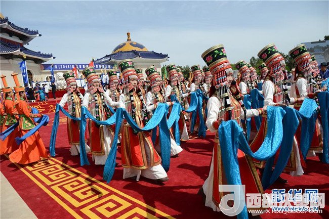 5月6日,在成吉思汗陵,身著盛裝的姑娘手捧哈達進行祭祀活動。新華社記者 鄒予 攝