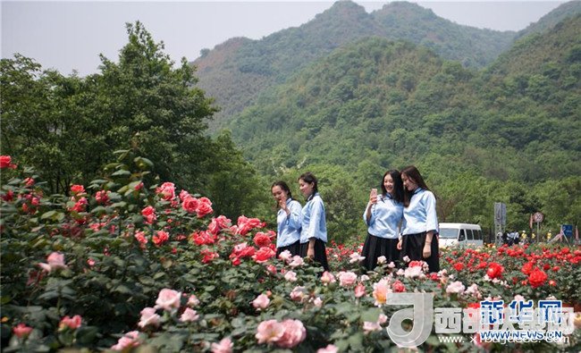 來自成都的大學(xué)生在位于四川綿竹市的“中國(guó)玫瑰谷”游覽拍照(4月18日攝)。新華社記者 張帆 攝