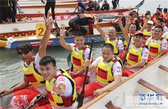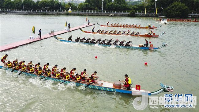 5月26日,參賽龍舟在浙江省溫州市會昌湖水面上比拼。當日,浙江溫州第五屆龍舟聯(lián)賽的一場比賽在會昌湖水上公園龍舟基地舉行。眾多龍舟同場競技,上演了精彩的水上比拼。新華社發(fā)(蘇巧將攝)