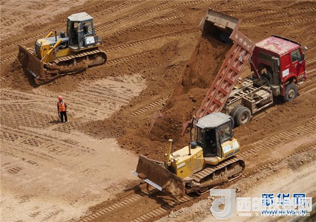 5月30日,工程車輛在延安黃河引水工程南河水庫(kù)施工現(xiàn)場(chǎng)進(jìn)行壩體填筑。