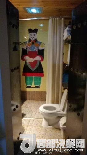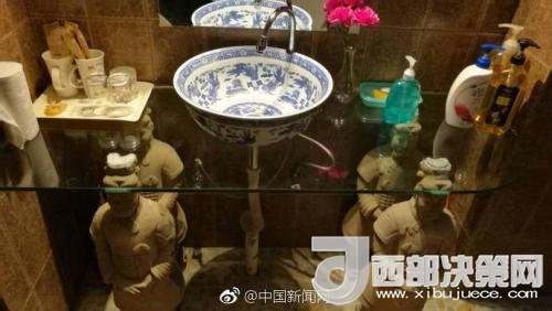 記者在網友曬出的圖片中看到,不僅衛(wèi)生間的墻壁上有兵馬俑的圖案,洗手臺也由四個俑“頂”著。