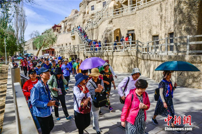 大批游人在莫高窟景區(qū)參觀游覽。王斌銀 攝
