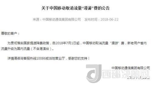 中國(guó)移動(dòng)22日在官網(wǎng)發(fā)布關(guān)于取消流量“漫游”費(fèi)的公告,公告稱,自2018年7月1日起,中國(guó)移動(dòng)取消流量“漫游”費(fèi),新老用戶省內(nèi)流量升級(jí)為國(guó)內(nèi)流量(不含港澳臺(tái))。