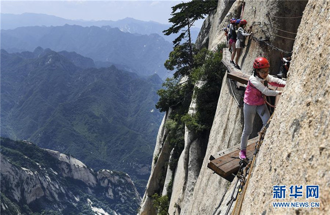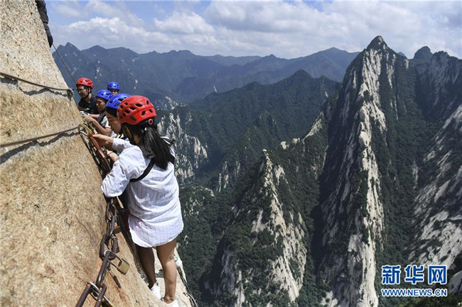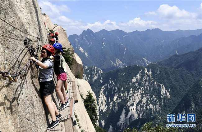 被譽為“華山第一天險”的長空棧道,位于陜西省華陰市五岳華山南峰東側山腰,在萬仞絕壁上鑲嵌石釘搭木椽而筑。 由于長空棧道貼崖懸空,對探險獵奇者極具誘惑性和挑戰(zhàn)性,吸引歷險探勝者絡繹不絕。新華社記者 陶明 攝