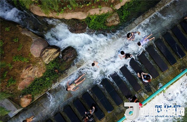 7月29日,市民在廣西柳州市窯埠古鎮(zhèn)人工瀑布群下消暑納涼(無人機(jī)拍攝)。