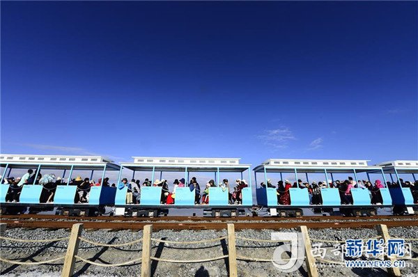 一列景區(qū)觀光火車從茶卡鹽湖景區(qū)內(nèi)經(jīng)過(8月14日攝)。 新華社記者張宏祥攝