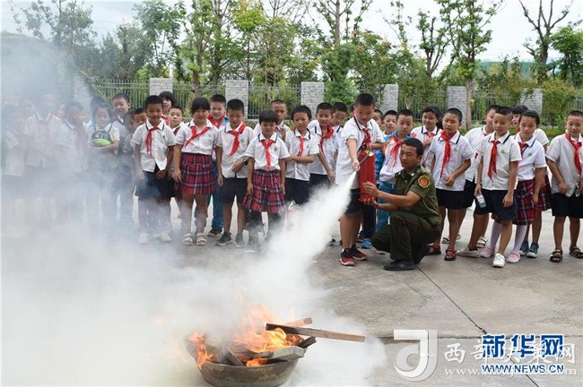 8月27日,余慶縣城關(guān)一小的學(xué)生在消防隊員的指導(dǎo)下學(xué)習(xí)使用滅火器。