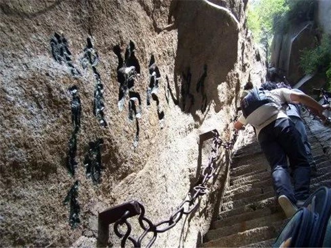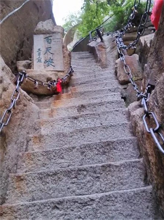 千尺幢位于回心石之上,是華山第一險(xiǎn)境。山幢壁直立,其間僅容二人上下穿行。兩邊鐵鏈垂直下垂,坡度為70°。從上到下共有370多個(gè)臺(tái)階,皆不滿(mǎn)足寬。