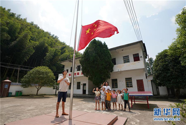 9月4日,在蘆嶺教學(xué)點,陳云根(后)和黃文春(前)帶著全校6名學(xué)生升國旗?,F(xiàn)在學(xué)校操場已經(jīng)鋪上了水泥。新華社記者 宋振平 攝