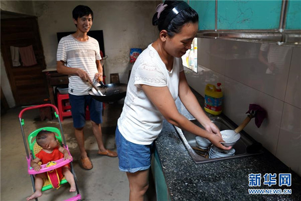 9月4日,在黃文春家中,黃文春和妻子歐陽沙在廚房做飯。黃文春2011年與同學(xué)歐陽沙結(jié)婚后,就把根扎在了蘆嶺,幾次放棄了考試進城教書的機會。 新華社記者 宋振平 攝
