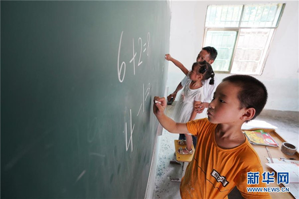9月4日,在蘆嶺教學(xué)點,陳云根在課堂上帶著孩子們做習(xí)題。 新華社記者 宋振平 攝