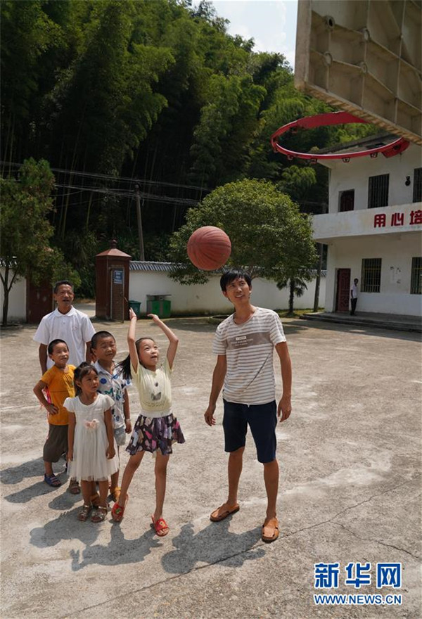 9月4日,在蘆嶺教學(xué)點,陳云根(左一)和黃文春(右一)帶著孩子們上體育課。 新華社記者 宋振平 攝