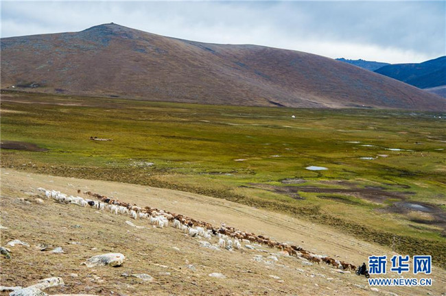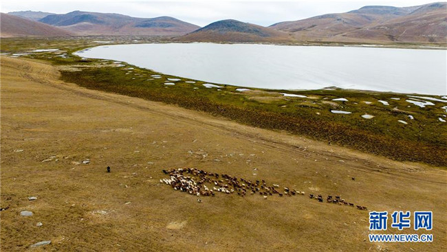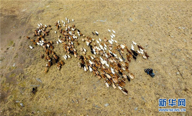 在青河縣查干郭勒鄉(xiāng)薩爾布拉克村,胡賽因·哈力都拉趕著羊群轉(zhuǎn)場(chǎng)(8月25日無(wú)人機(jī)拍攝)。新華社記者江文耀攝