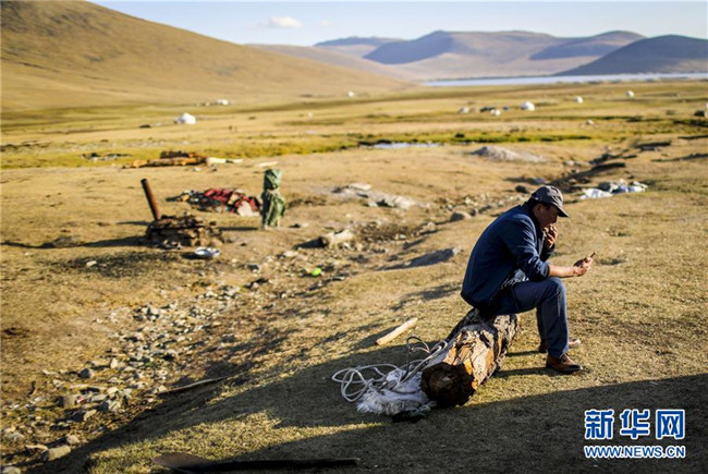 在青河縣查干郭勒鄉(xiāng)薩爾布拉克村,胡賽因·哈力都拉在牧場(chǎng)上用手機(jī)上網(wǎng)(8月23日攝)。新華社記者江文耀攝