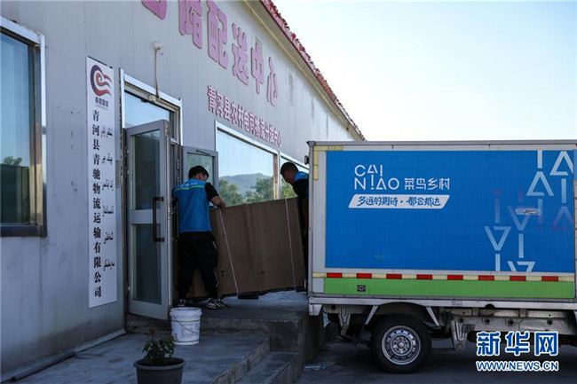 快遞員從青河縣農(nóng)村電商物流分撥中心將網(wǎng)購(gòu)的摩托車(chē)運(yùn)上快遞車(chē)(8月24日攝)。新華社記者江文耀攝