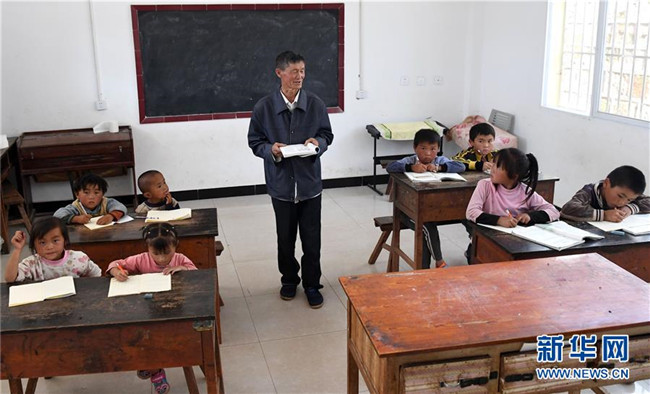 9月5日,云南省祿勸彝族苗族自治縣撒營盤鎮(zhèn)三蒙村阿依羊小學教師王正祥在給學生們上課。阿依羊小學位于海拔2600米的山間,交通不便,全校只有8名學生。而今年56歲的王正祥既是學校唯一的老師,也在生活上給了孩子們無微不至的關心。1980年,王正祥開始從教,在大山深處一干就是38年。他說:“村里就我一個老師,只要有一個學生,我都要教下去,不讓孩子輟學。希望他們像小鷹一樣飛出大山,能有更光明的未來。”新華社記者 藺以光 攝