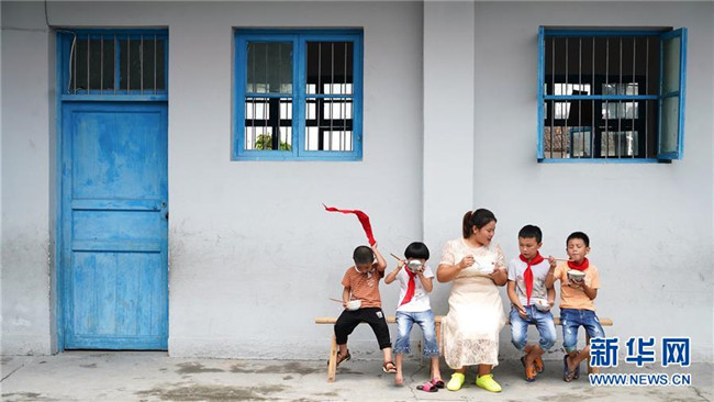 9月4日,江西樂安縣金竹畬族鄉(xiāng)半坪小學教師陳春英和學生們坐在教室外吃午飯。2014年,身為“90后”的陳春英和其他幾位從師范院校畢業(yè)的同伴來到深山,開始了特崗教師的生涯。幾年過后,陳春英成為唯一留下來的一位。這幾年,在山區(qū)生活教學的陳春英遇到了很多新鮮事,也收獲了很多友誼。她說:“看到學生們健康長大,村民們對我的信賴不斷加深,我覺得這樣的生活也是一種幸福。”新華社記者胡晨歡 攝