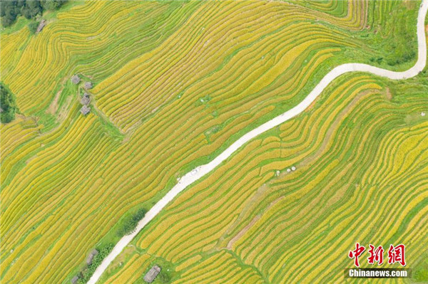 遠(yuǎn)眺貴州省榕江縣陽開梯田秋色,金黃的水稻與苗寨相映成趣。 中新社記者 賀俊怡 攝