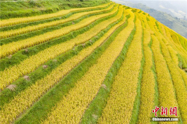 金秋時節(jié),貴州省榕江縣計劃鄉(xiāng)陽開梯田水稻進(jìn)入成熟期,金黃色的梯田構(gòu)成了一幅美麗的秋天圖景。