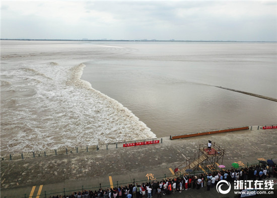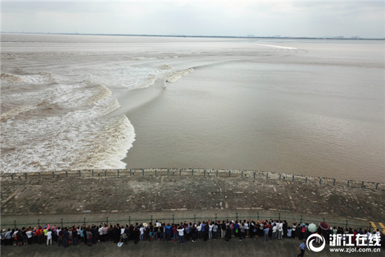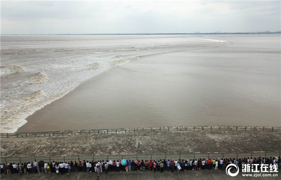 9月26日,農(nóng)歷八月十七,海寧大缺口觀潮點(diǎn),千名游客在江堤上安全觀潮。據(jù)海寧鹽官水文站預(yù)測(cè),從當(dāng)天開(kāi)始,錢(qián)塘江進(jìn)入最佳觀潮期,預(yù)計(jì)八月十八大潮日,潮高會(huì)在1.5米左右。(浙江在線(xiàn)記者 董旭明 攝)