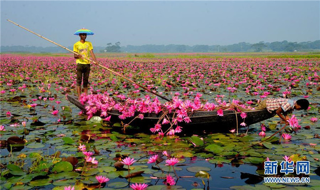 10月7日,在孟加拉國(guó)巴里薩爾地區(qū),當(dāng)?shù)鼐用裨诓烧彙?近日,孟加拉國(guó)巴里薩爾地區(qū)的睡蓮進(jìn)入盛開(kāi)時(shí)節(jié)。 新華社發(fā)(薩利姆·禮薩 攝)