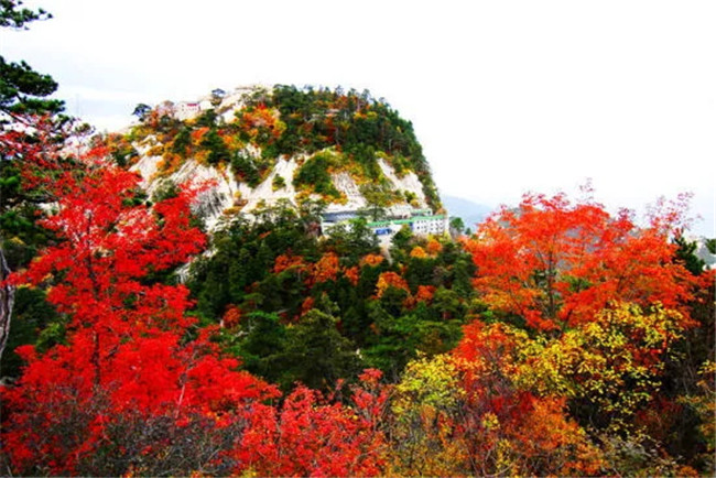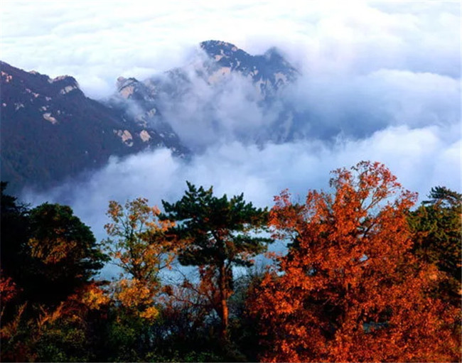 鷂子翻身、長(zhǎng)空棧道、蒼龍嶺,更是險(xiǎn)中紅葉別樣紅。西峰上茫茫云海,紅葉相伴,美輪美奐。