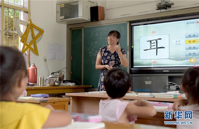 在安徽省黃山市黃山區(qū)烏石鎮(zhèn)清溪中心小學(xué)茶兒垅村教學(xué)點內(nèi),蔣秀蘭老師在給孩子們上語文課(9月7日攝)。今年53歲蔣秀蘭老師從1983年參加工作開始,一直獨自堅守在“一人一校”的單班教學(xué)點,最多的時候獨自一人帶過26名學(xué)生,目前她負責(zé)兩個年級5個孩子7門課的教學(xué)。 新華社記者 王正忠 攝