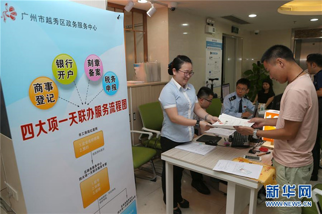 7月19日,“四大項一天聯(lián)辦服務(wù)專窗”在廣州市越秀區(qū)政務(wù)服務(wù)中心亮相,工作人員將營業(yè)執(zhí)照遞交給申請者。 新華社記者 張加揚 攝