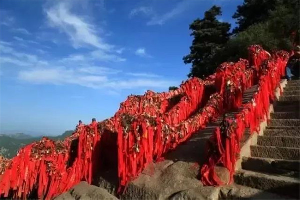 到達(dá)金鎖關(guān)時,一番令人動容的風(fēng)景——金鎖關(guān)關(guān)內(nèi)、關(guān)外登山路兩側(cè)的鐵索上,情侶鎖重重疊疊,紅繩彩線迎風(fēng)搖曳,筑成一道美麗的愛情心愿風(fēng)景線。 眼前大片大片的紅色,令游人的視覺和心靈受到強烈的沖擊。這是沿路兩邊鐵鏈上綁滿的密密麻麻的紅色絲繩,不留一絲空隙,風(fēng)吹來,長長的紅色絲繩就輕盈的舞起來,如愛情牢固的臂膀,甜蜜的飛翔在華山之上。
