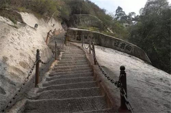 蒼龍嶺為華山著名險道,為連接北峰同南部諸峰的一刃形山脊,道行山脊,如在刃上,兩側(cè)絕壑千尺,深不見底。因嶺呈倉黑色,勢若游龍,故名。它莽莽蒼蒼,筆直插天,好像蒼龍騰空,所以被稱為“蒼龍嶺”。此嶺上的臺階只有2尺多寬,兩旁萬丈深壑,勢陡如刀削斧劈。嶺脊上下高差約500米,坡度在45度以上。在這里遙望青松白云,耳聽風聲大作,令人心驚目眩。游人到此,莫不驚嘆。