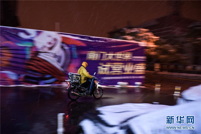 在青海省西寧市,一名外賣配送員冒雪騎行(11月3日攝)。 11月3日,青海省西寧市等地迎來降雪。 新華社記者 吳剛 攝