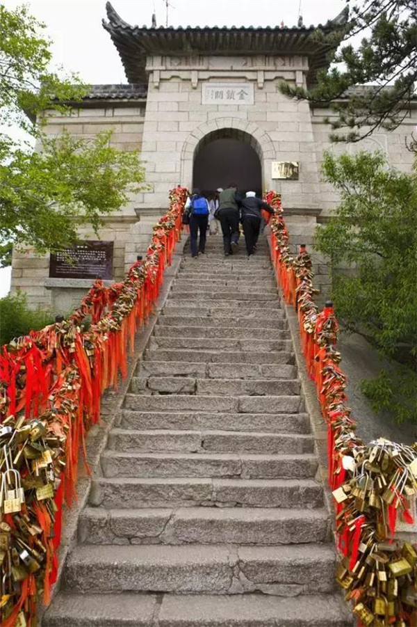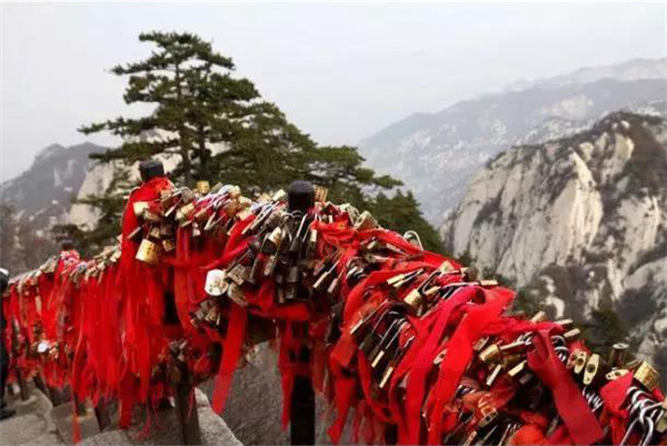 金鎖關(guān)北接五云峰,南控華山主峰,東西兩側(cè)壑深千丈,關(guān)前僅有一米完的臺階石徑。環(huán)周古松蒼翠,奇石林立,常有祥云環(huán)繞,風(fēng)光非常迤麗。“但有女兒初長成,便為三秦姣姣容。”說的就是奇險(xiǎn)天下第一山的華山除了以其奇、險(xiǎn)、秀而聞名遐邇之外,還別有一番令人動(dòng)容的金鎖關(guān)風(fēng)景:關(guān)內(nèi)、關(guān)外登山路兩側(cè)的鐵索上,情侶鎖、平安鎖,重重疊疊,紅繩彩線迎風(fēng)搖曳,筑成一道美麗的愛情風(fēng)景線,鎖住對愛情的誓言,表達(dá)堅(jiān)如磐石的愛情忠貞!