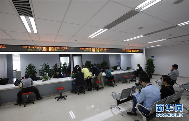 這是設(shè)在上海張江高科技園區(qū)管理委員會大樓內(nèi)的中國(上海)自由貿(mào)易試驗區(qū)張江行政服務(wù)中心辦事大廳一角(2015年3月31日攝)。新華社記者方喆攝