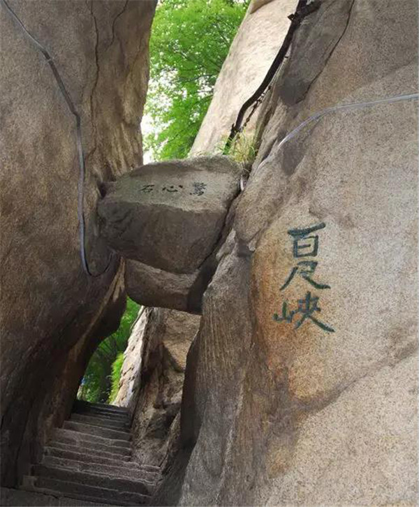 也叫“百丈崖”,過了千尺幢向北折即可到達(dá),是登華山的第二個(gè)險(xiǎn)境。這里山體峭陡壁立、四方如削,猶如斧子直辟而開,幾近垂直90度,在旁邊山體覆滿的墨綠植被的映襯下,華山的陽剛挺拔之態(tài)盡顯。和千尺幢一樣,百尺峽也是巖隙險(xiǎn)道,有石階91級(jí),游人須挽鐵索而上。