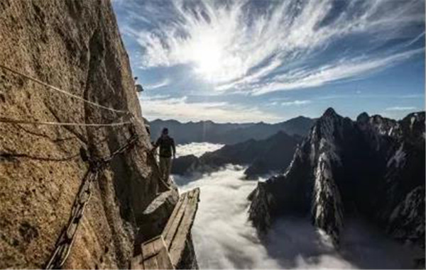 “自古華山一條路”則是經(jīng)典的登山路線,即從玉泉院出發(fā),經(jīng)五里關(guān)——莎蘿坪——毛女洞——青柯坪——回心石——千尺幢——百尺峽——老君犁溝——北峰——擦耳崖——蒼龍嶺——五云峰——金鎖關(guān),到達(dá)金鎖關(guān)后,便可登上中峰,以環(huán)線游覽東、西、南三峰。當(dāng)然,長(zhǎng)空棧道和鷂子翻身也是必不可少的挑戰(zhàn)。